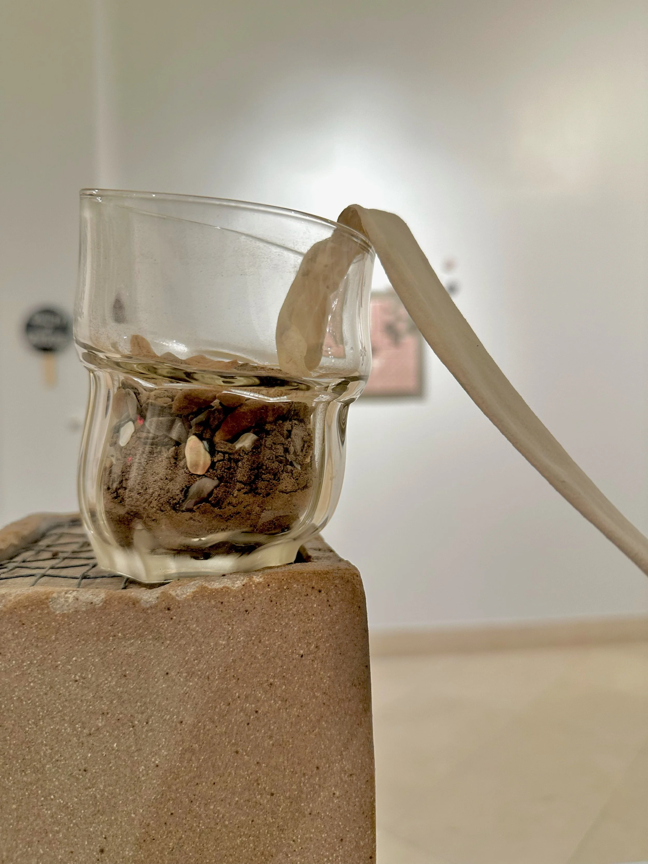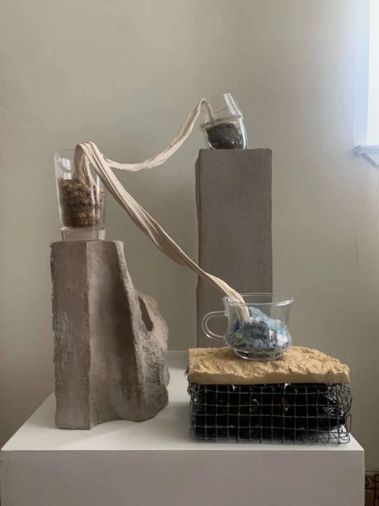 This still life sculpture is made from clay, glass, and metal. Inspired by the survival skills videos coming out of Gaza, Palestine teaching folks how to filter water.