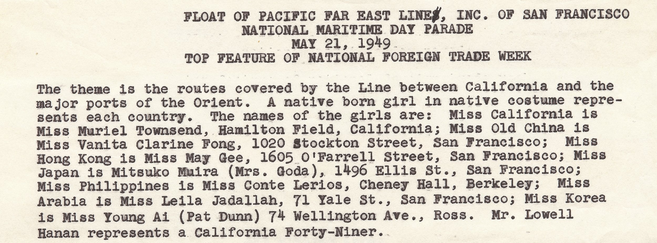 Her brother tells us that Tete Leila ended up on this float through the families that worked and operated the Ramallah Wholesale in the 40s. As importers and wholesalers, dealings with shipping lines like the PFEL was a regular occurrence for the Ramallah Wholesale, so when approached for a female to represent their new shipping routes into the "Orient", Tete Leila happened to be the only girl among the families and became this small part of San Francisco Maritime History.